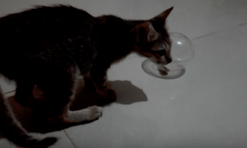 As it tries to discover the trick to reaching the food, the cat pushes the ball around the floor chasing after the treat it just can’t seem to get ahold of. No amount of swatting or chasing will open the clear ball up though.